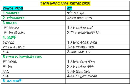 በስብሰባው ከተከናወኑት ተግባራት አንዱ የማኅበሩን ሥራ አስፈጻሚ አባላትንና የተለያዩ ዘርፍ መሪዎችን መምረጥ ነበር። በዚሁ መሠረት ከዚህ በታች ስማቸውና የሥራ ድርሻቸው በዝርዝር የተጠቀሰ ወንድሞችና እህቶች በጉባዔው የተመረጡ መሆኑንና እስከ ቀጣይ የምርጫ ዘመን ኃላፊነታቸውን እንዲወጡ አደራ የተሰጣቸው መሆኑን ስንገልጽ በታላቅ ደስታ ነው።